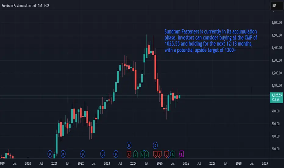 Sundram Fasteners is currently in its accumulation phase. Investors can consider buying at the CMP of 1025.55 and holding for the next 12–18 months, with a potential upside target of 1300+