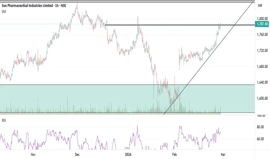 the RSI is moving uptrend and has made a cup and handle pattern. If it opens above 1785 on 27 Feb, it should continue to rise till 1850 in near future. It might be a good idea to wait for minor correction till 1740 but it looks difficult with increasing volume.