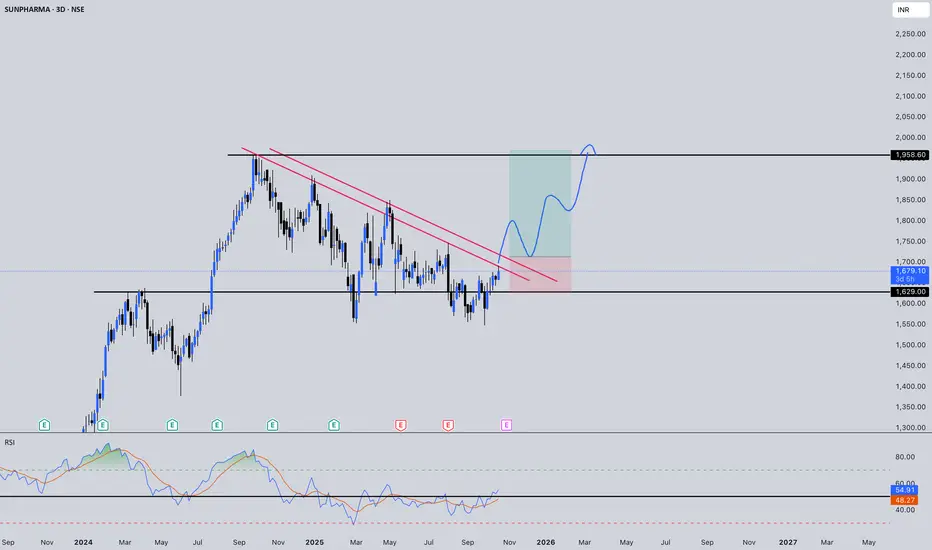 After correcting 20%+ from ₹1,958 ATH, SUNPHARMA has spent 12 MONTHS building a base around ₹1,629. Classic descending triangle forming at apex.