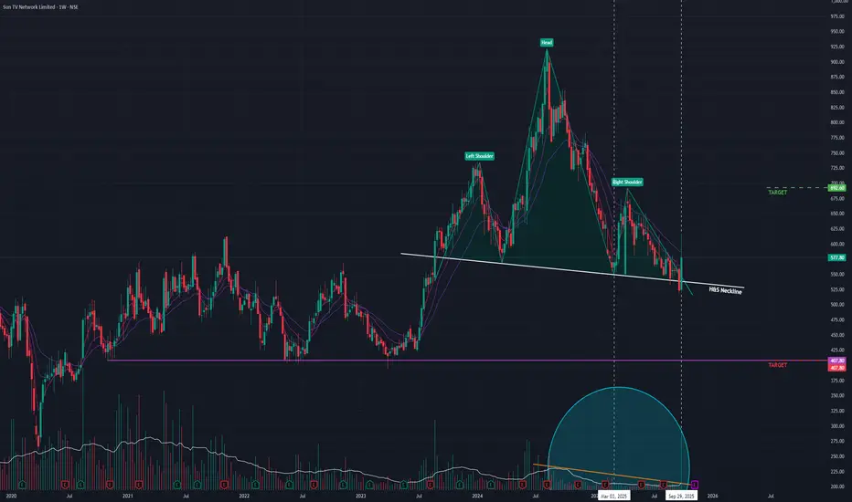 Sun TV has formed a classic Head and Shoulders pattern, a well-known technical formation that typically signals a bearish trend reversal. The stock is currently trading near the critical "neckline" support of this pattern. A decisive break below this level would confirm the pattern and could signal the start of a significant downtrend.