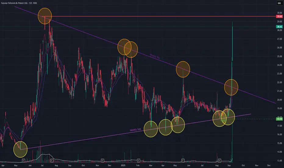Surana has formed a Triangle formation which it Broke-Out last week confirming a bullish momentum. Short-term EMAs are in a PCO state. Today the stock opened Gap-up and formed a strong bullish candle (16.86%) with huge volume. A Golden Cross-over in both EMAs and DMAs may form in the coming days, which is a bullish signal, confirming the momentum.