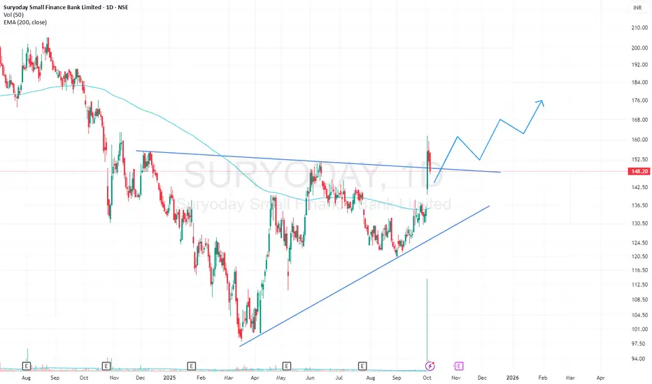 Suryoday SFB has given a breakout from a Triangle pattern with high volumes on 1D timeframe. The stock is apparently retesting its resistance trendline. The stock is also trading above its 200EMA.
