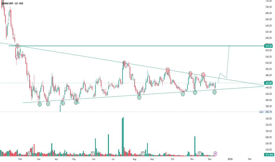 The stock has been moving inside a falling wedge + rising support channel for months.