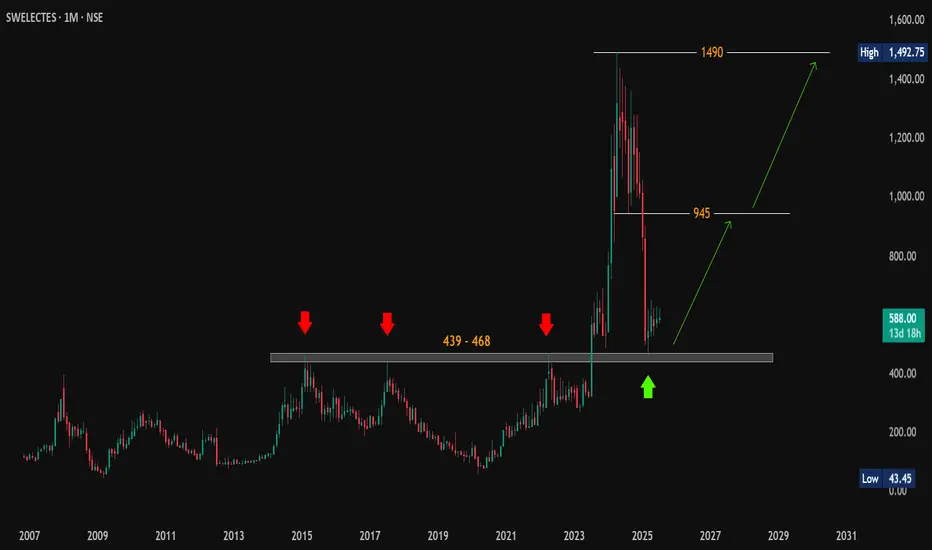 The stock had earlier faced strong resistance in the 439–468 zone, getting rejected multiple times (2015, 2017, 2022). Eventually, it broke out of this range in 2013, leading to a sharp +200% rally.