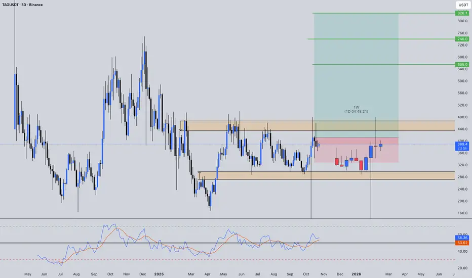TAOUSDT has established a multi-month consolidation structure between $280-$440. Price action shows compression within this zone with multiple tests of both boundaries.
