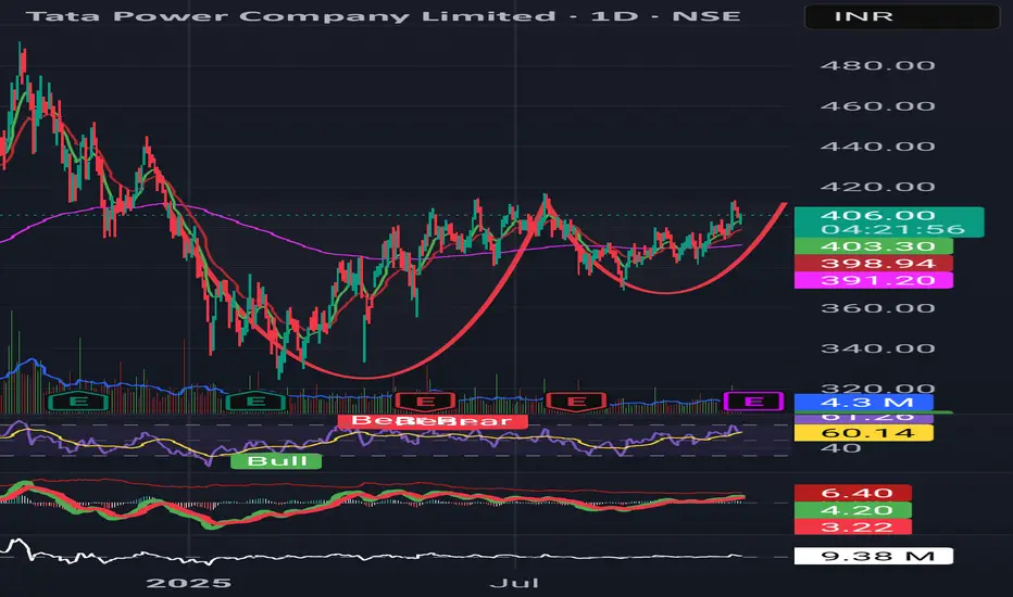 Structure: Handle formation visible near ₹400–₹410 zone; consolidation on low volume.