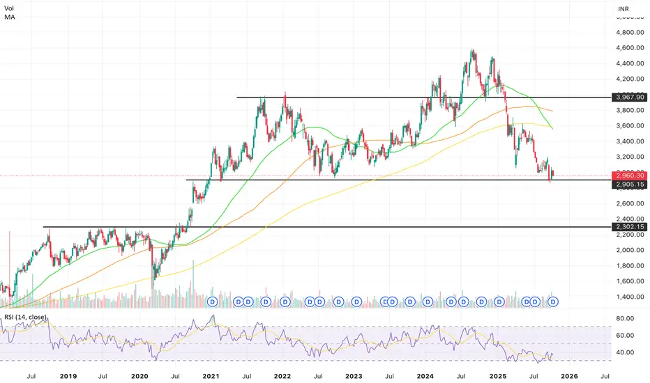 TCS is near to its weekly support zone of 2900. Risk reward ratio favourable for long term. Start accumulating from current levels, may see maximum correction till 2550 though it’s unlikely.