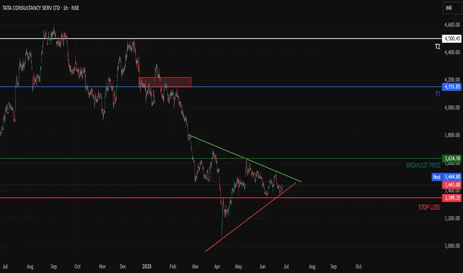 Here is the 1H time frame of TCS which is making a triangle pattern with converging prices at the bottom its recent downtrend.