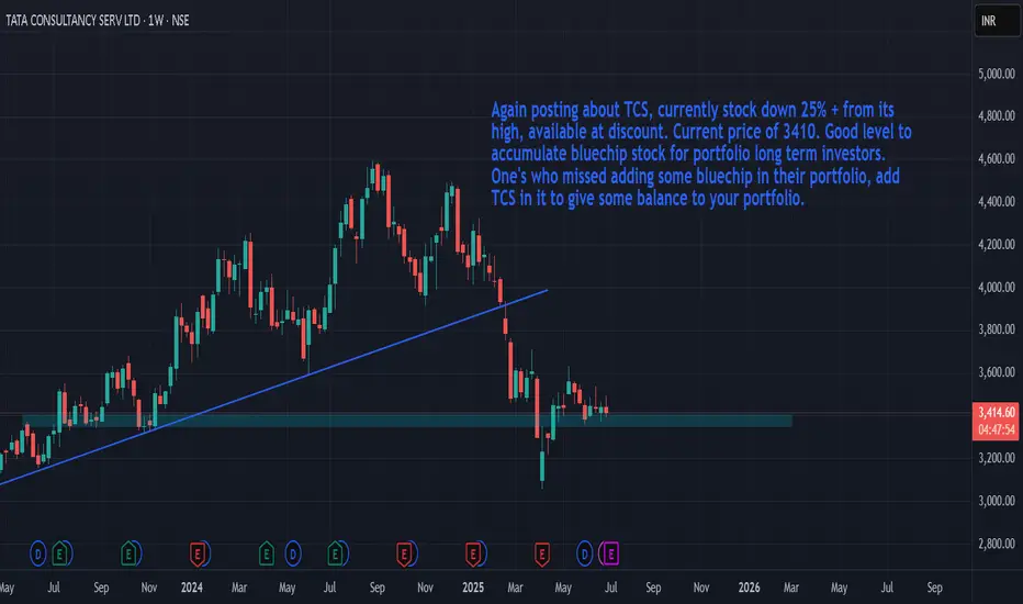 Again posting about TCS, currently stock down 25% + from its high, available at discount. Current price of 3410. Good level to accumulate bluechip stock for portfolio long term investors. One's who missed adding some bluechip in their portfolio, add TCS in it to give some balance to your portfolio.