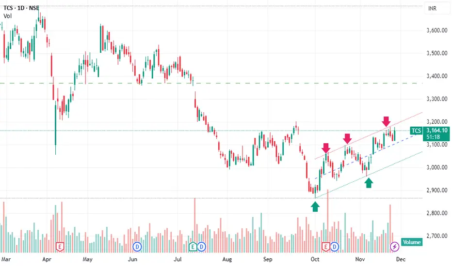 TCS continues to maintain a robust medium-term uptrend within an upward sloping channel. The pattern signals trend strength, consistent institutional participation, and a favourable risk-reward setup on dips. Traders and investors may monitor pullback entries near support and watch for a potential breakout above the channel resistance.
