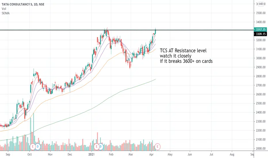 TCS after good fall now it is rising and currently at resistance level so watch it carefully above 3350, 3600 can be seen in short span.
