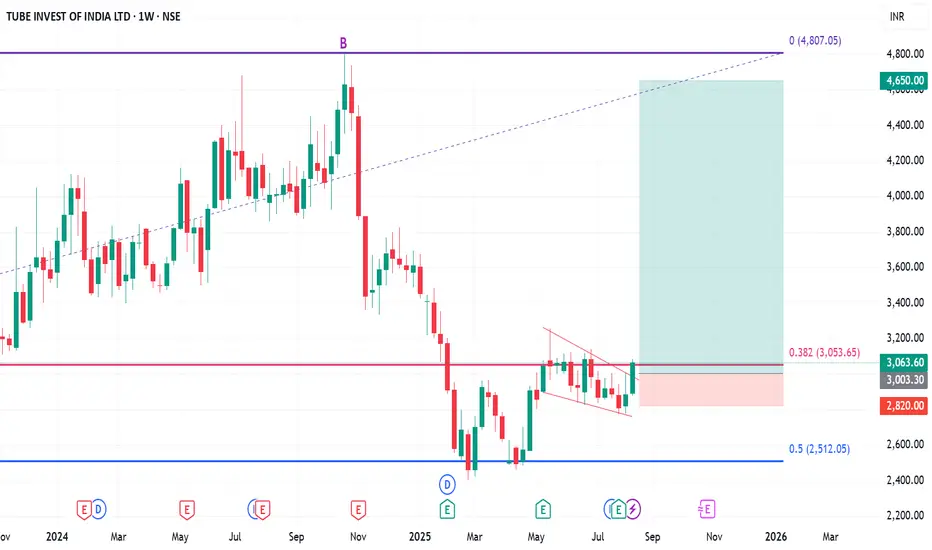 1. On Weekly timeframe if we draw Fibonacci retracement from the all time swing low (A) to the all time swing high (B) then the stock took support from the 0.5 Fibonacci level.