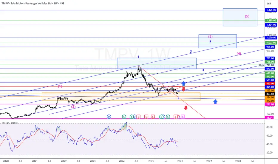 TMPV has completed a major impulsive rally from Covid lows and is currently in a Wave (2) corrective structure after topping around the 950–1000 zone (projected Wave 1 peak). The corrective move looks controlled and remains within long-term rising channel support.