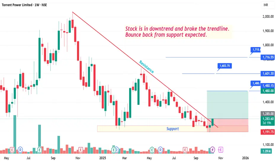 Stock was in a downtrend but has now broken the trendline and is showing a bounce from support near ₹1,200 zone.