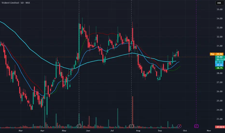 Price bounced from the ₹28 zone, reclaiming the 20 & 50 MAs.