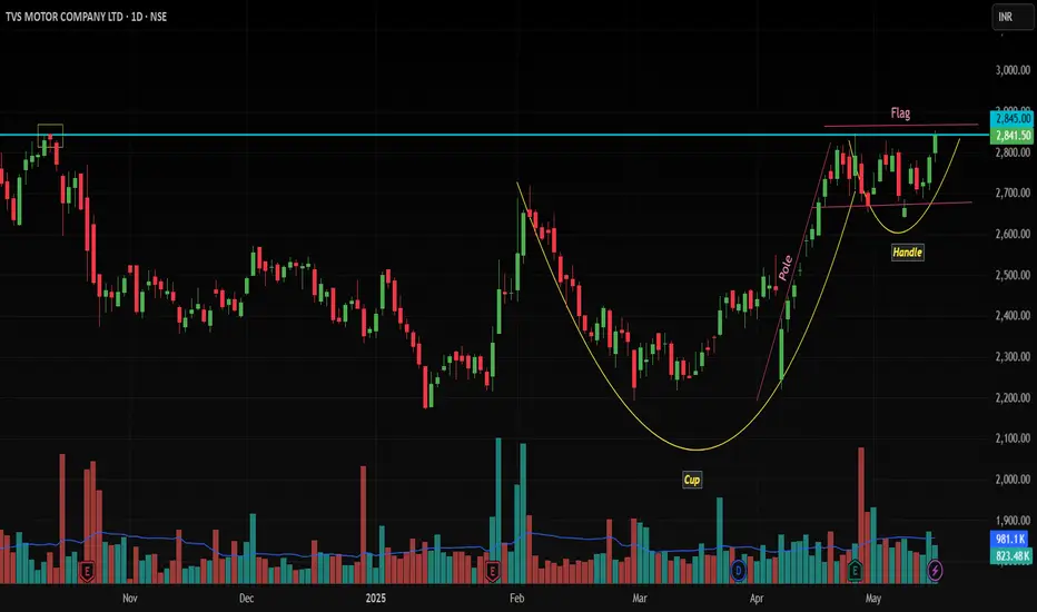 TVSMOTOR’s daily chart shows a textbook Cup & Handle pattern, supported by rising volume and bullish momentum. A breakout above 2845 opens the path to retest ATHs, with minimal resistance beyond. Trade the breakout, respect the SL, and ride the trend!