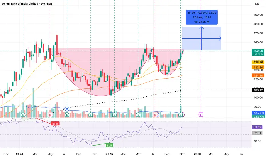 Union Bank (NSE: UNIONBANK) is displaying a classic Cup and Handle formation on the weekly timeframe, indicating a potential continuation of the long-term uptrend.