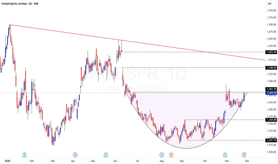 Textbook example of Accumulation seen at the lower levels (1290-1360) and the price is trying to breakout of a Rounding bottom / Cup & Handle pattern