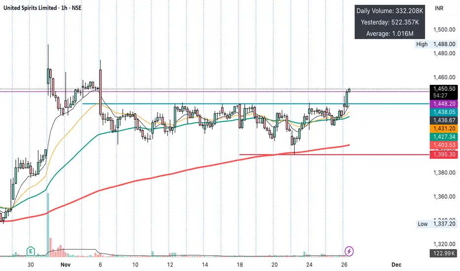 5. **The Breakout (Today - Nov 26):** The price is breaking above the hourly resistance and the daily consolidation high at `₹1,448.20`. This is our multi-timeframe confirmation.