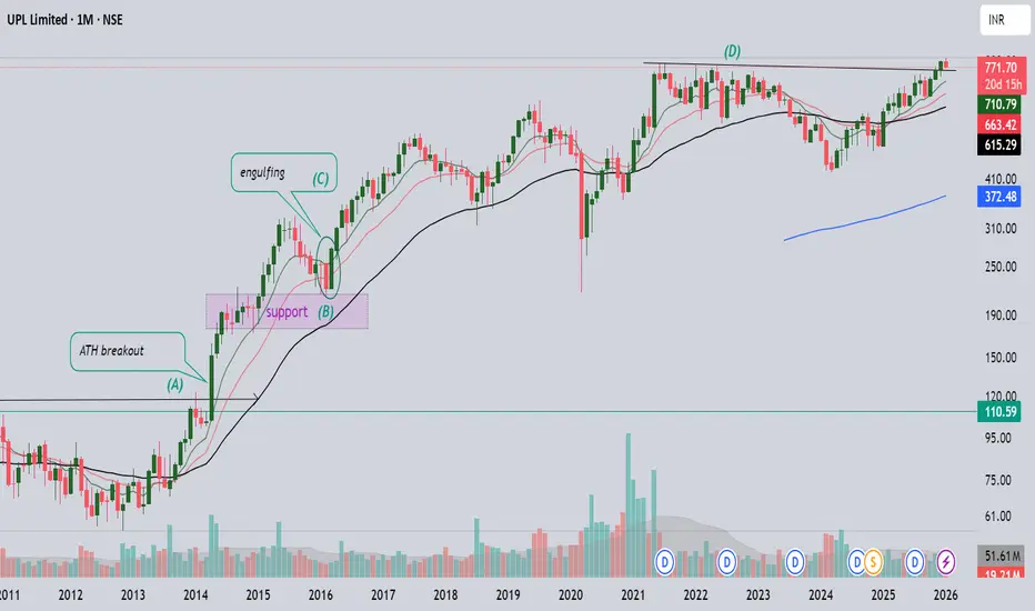 The stock we are analyzing is UPL Limited. Once again, we have seen an all-time high breakout followed by consolidation. The long-term trend line, respected since June 2021, has now been broken by the December 2025 monthly candle.