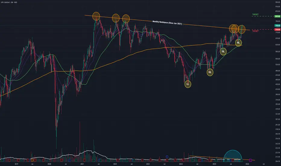 - Support: The price would likely fall to re-test the angular resistance-turned-support at ₹730. A "bounce" off this level would be a classic, healthy confirmation of the breakout.