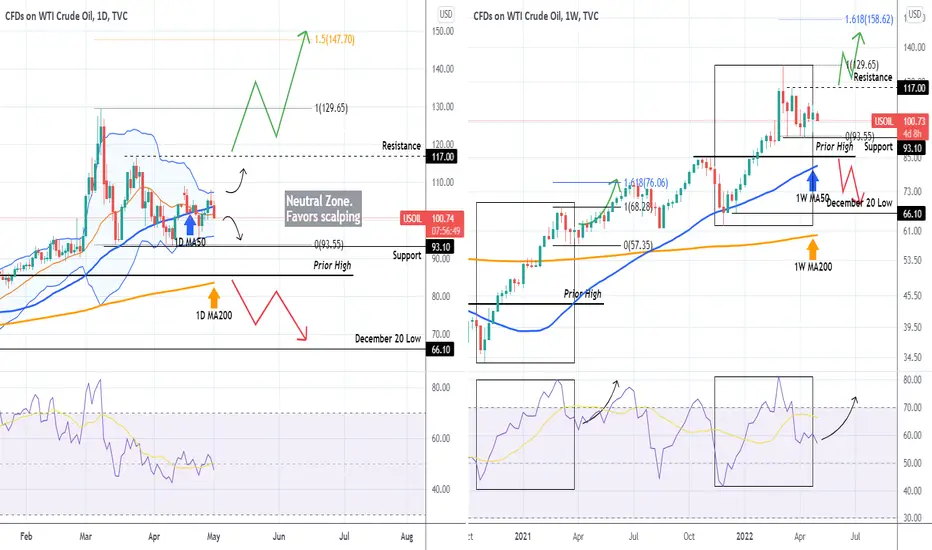 On the longer-term 1W time-frame though (chart on the right), we see that the last 5 months resemble the price action of late 2020/ early 2021. The 1W TSI sequence is fairly similar and the longer we trade sideways on the medium-term the more it favors the consolidation bias of the accumulation scenario of March - April 2021 and then bullish break-out towards the 1.618 Fibonacci extension. A break below the 'Prior High' level of 85.00 would break both the 1D MA200 and the 1W MA200 (orange trend-lines on both charts) and should target the 66.10 December Low at least.
