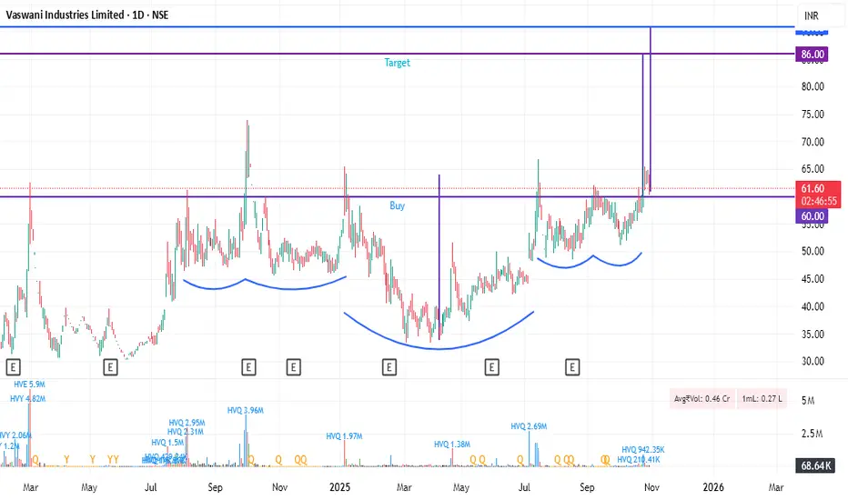 VASWANI INDUSTIRES LIMITED is forming inverse head and shoulder pattern on daily and weekly timeframe suggesting a bullish pattern.