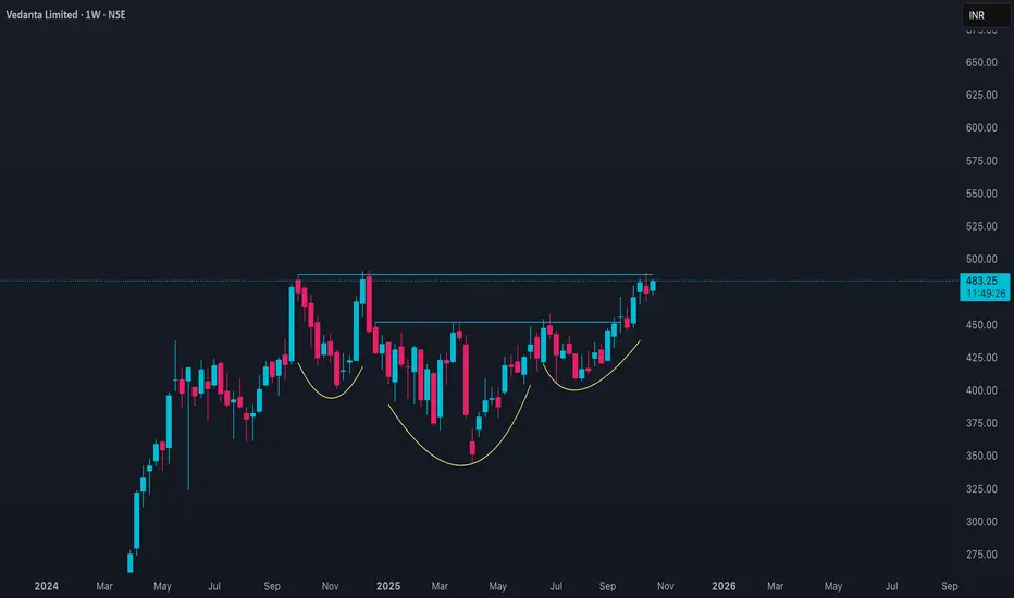 As of October 23, 2025, **Vedanta Limited (VEDL)** closed at around **₹483.25**, up approximately **1.6%** from the previous close near ₹475.65. The stock traded within a range of ₹474.65 to ₹484.85 during the day, reflecting sustained buying interest and moderate volatility.