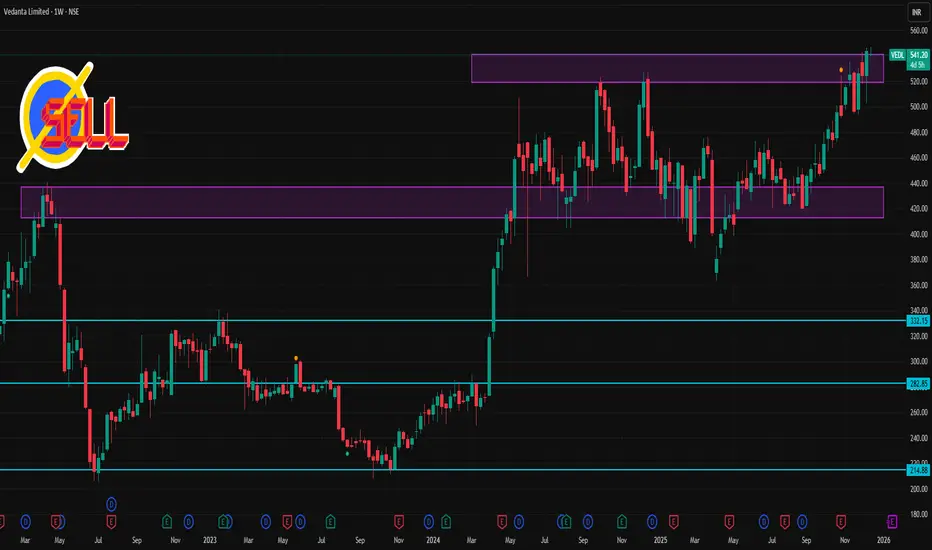 R2: ~₹555 – ₹560 — broader upside/wider resistance (weekly chart often reflects overhead supply near recent highs).