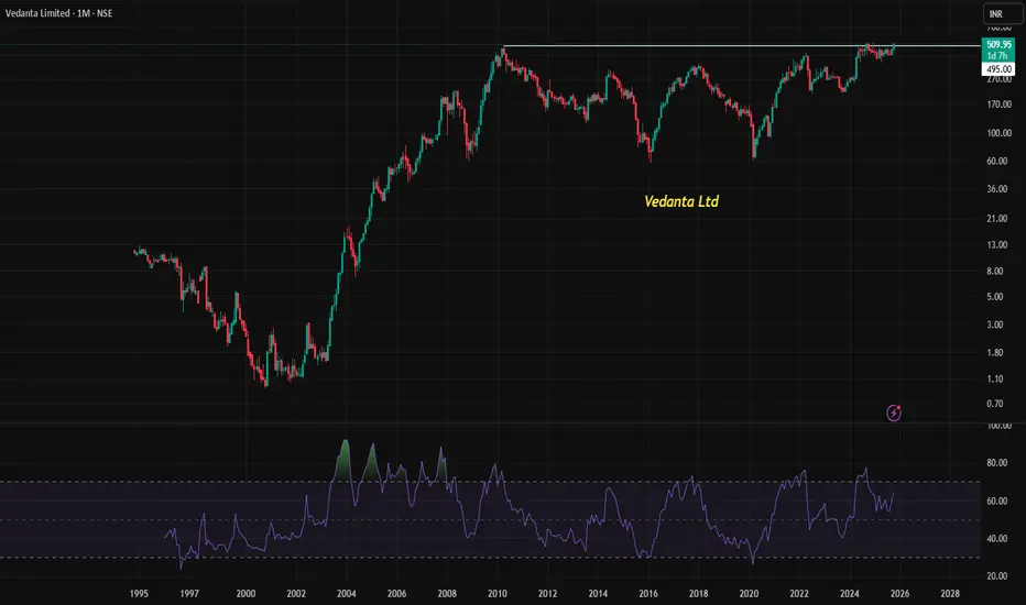 Vedanta Limited is experiencing a major technical breakout, surpassing its previous lifetime high from 2010, with strong RSI momentum signaling bullish strength.