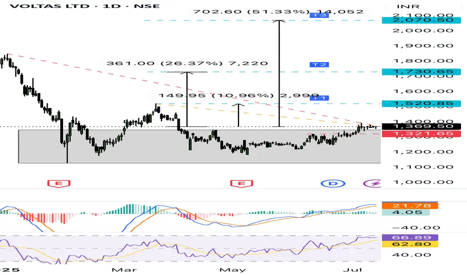 Voltas Ltd is showing a strong base breakout after a long consolidation between ₹1220–1370.