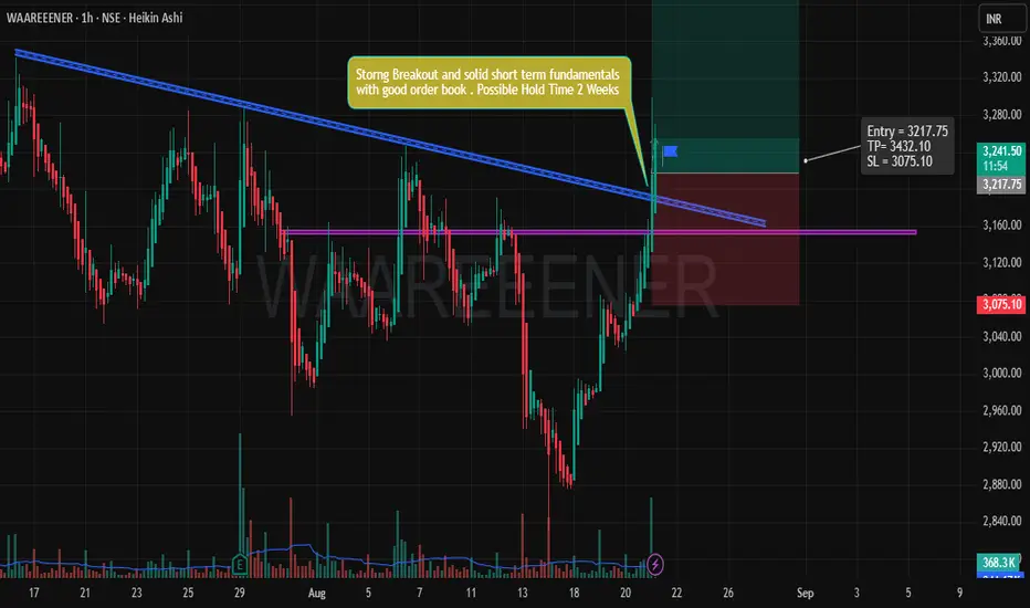 This is a solid bullish setup based on the breakout above the resistance, accompanied by increasing volume, healthy market sentiment, and strong short-term fundamentals. The risk-reward ratio supports this trade idea, and the target of ₹3432.10 offers a clear upside.