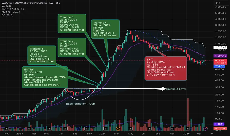 This backtested trade on Waaree Renewables Technologies Ltd. (BSE: 534618) was a highly successful momentum play, yielding over 500% (5x) gains in seven months. Entry at ₹305 was based on a breakout confirmation, followed by tranche-based accumulation as the stock hit new highs with strong volume. The stock peaked above ₹2900, and the disciplined exit at ₹1835 was triggered by a breakdown below EMA21 & PSAR with high selling pressure, avoiding further downside. The strategy effectively captured the uptrend while managing risk, reinforcing the importance of scaling during strength and exiting on clear weakness.
