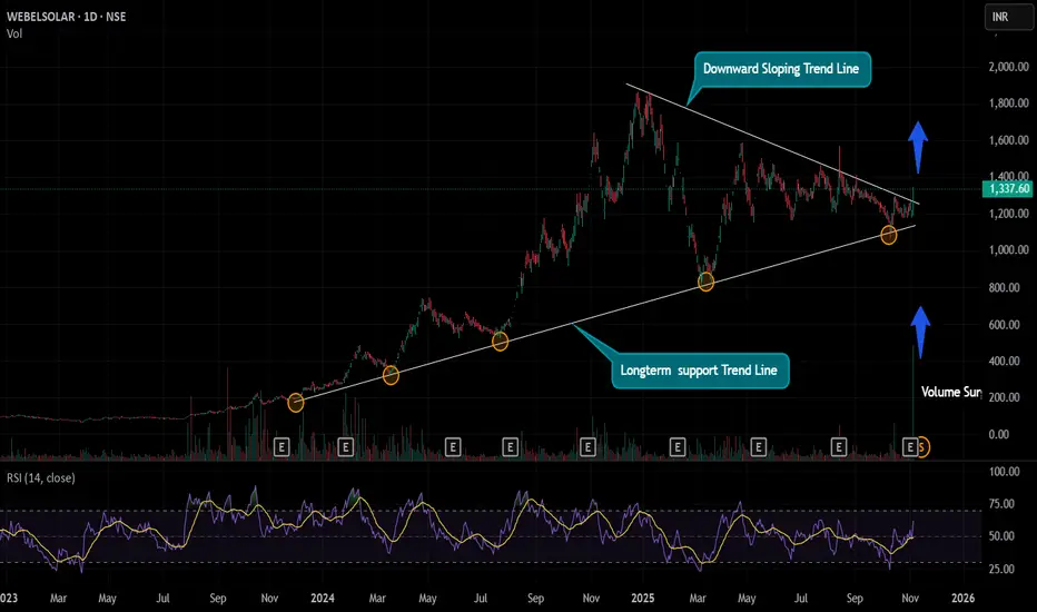 This is the daily chart of the Websol Energy System Ltd. The stock is respecting the 2 years upward sloping trendline and trying to come out of the resistance line with good volume.