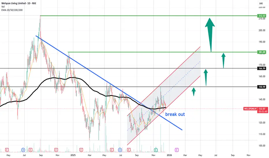 Welspun Living Ltd. (NSE: WELSPUNLIV) is showing signs of a significant trend reversal as it breaks out of a downward channel, supported by a surge in volume. After multiple attempts to move higher, the price action has finally broken above the crucial resistance at ₹132.90, signaling the potential for an uptrend. Here’s the breakdown: