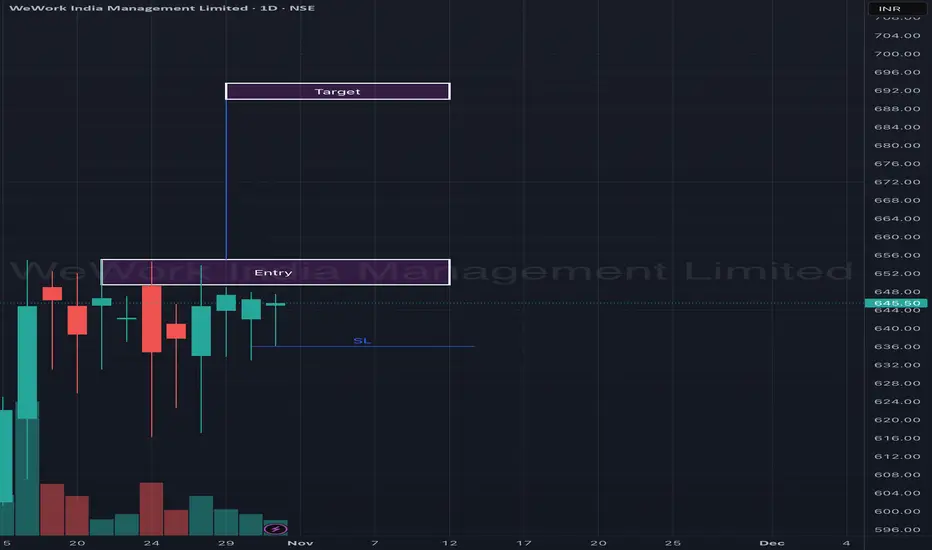 WeWork India is consolidating within a narrow range and is now approaching a potential breakout zone on the daily timeframe. After the recent listing volatility, the stock has formed a short-term base between ₹635–₹650, showing signs of absorption of supply around the resistance zone.