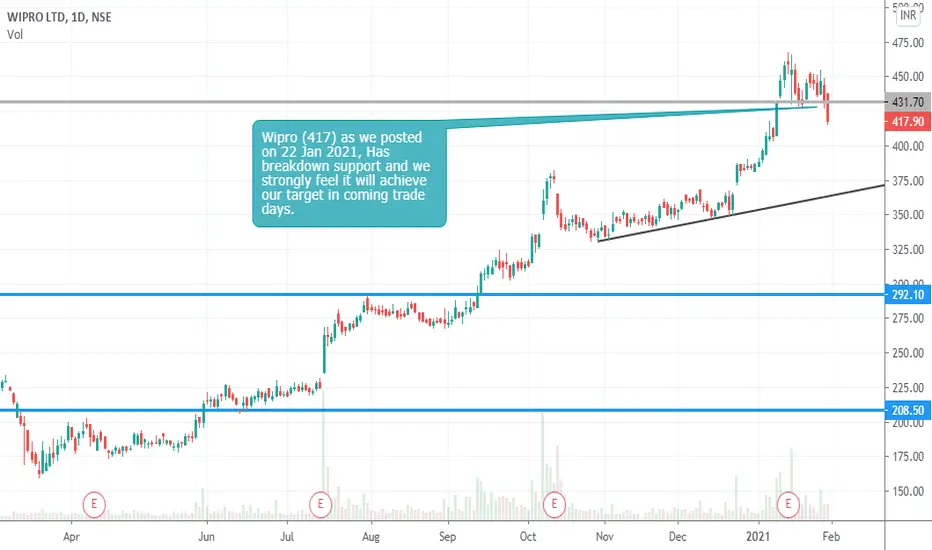 Wipro (417) as we posted on 22 Jan 2021, Has breakdown support and we strongly feel it will achieve our target in coming trade days.