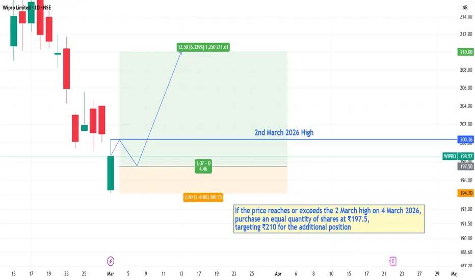 If the price reaches or exceeds the 2 March high on 4 March 2026, purchase an equal quantity of shares at ₹197.5, targeting ₹210 for the additional position