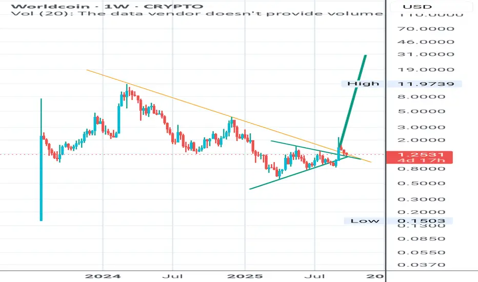 I would like to present an Idea of exponential gains. Worldcoin recently broke out of two triangles; a small trinagle the price target of which has already been hit and a breakout of a very big triangle. The price is currently retesting the breakout line of the triangle. Please have a look at the chart. I would also highlight that 80% of the supply of world coin is held by the insiders therefore it is in their interest to take the price up. But also the insiders are the major sellers of the leverage longs and than dump the token to grab liquidity. Therefore insider benefit from both price going up and down. I suggest all of you not to give the opportunity to insiders to grab liquidity by going long with leverage because in that scenario their best interest is to liquidate you because if you are leveraged long the other side of your trade is leverage short (which is insiders). Instead buy spot in that case insiders have no choice but to pump the price because dumping will not be in their interest as their is no free liquidity to grab.