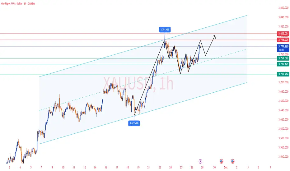✅ From the 1-hour chart, gold rebounded sharply after testing the 3722 level, reaching as high as 3783, and is currently consolidating near 3775. Consecutive bullish candles indicate strong short-term momentum.
