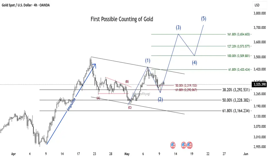 Of which wave 1 is completed, reaching a high of 3435. The market is currently in wave 2, and the next possible moves are marked as impulse counting (blue 12345).