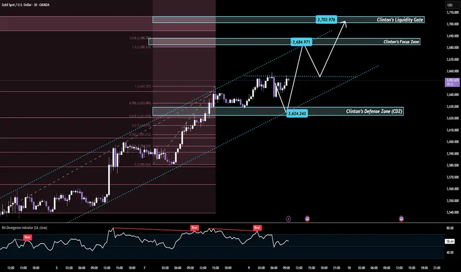 If CDZ ($3,624) holds, Gold could push higher toward CFZ ($3,684) and even test CLG ($3,704).