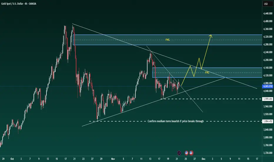 On the H4 frame, gold is still trading within a broad triangle structure. The previous decline has stalled, with prices continuously reacting at the upward support line and around 4,000, but there has yet to be a clear breakout from the pattern.