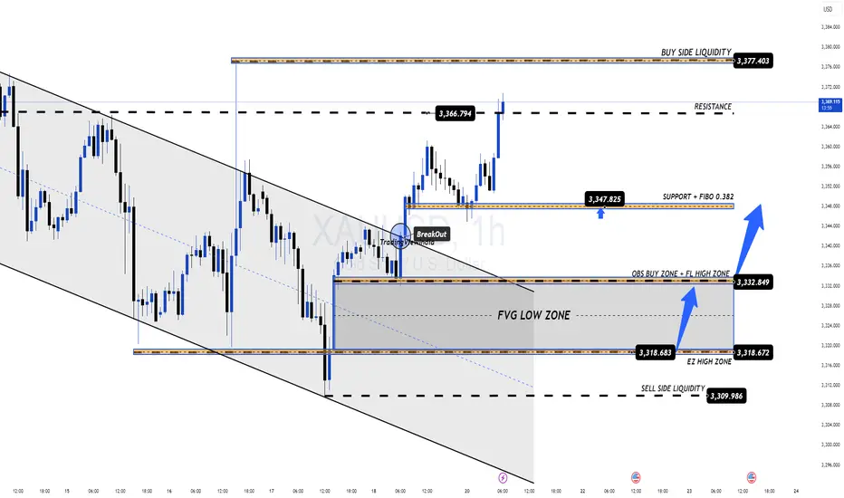 ✅ Breakout confirmed above the previous SELL ZONE at 3377 – 3379, showing that buyers are dominating the short-term trend.