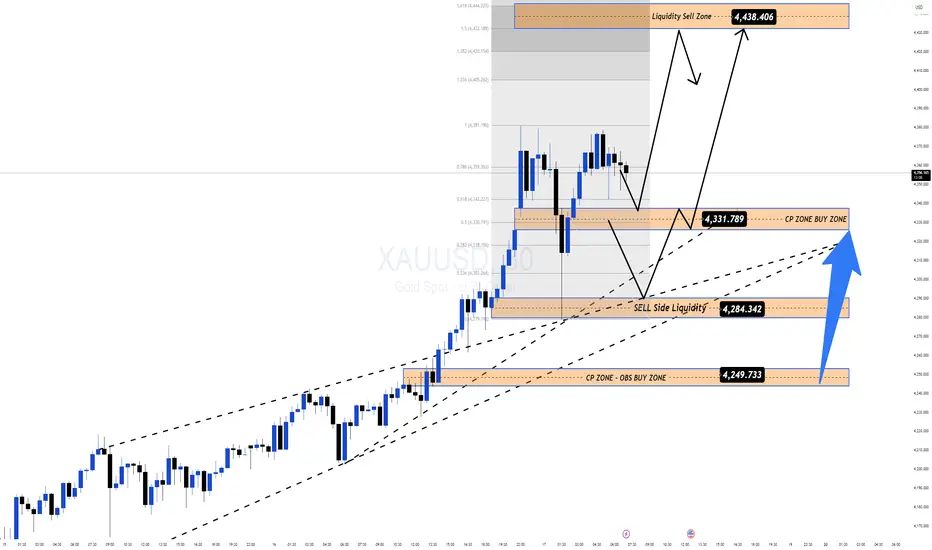 If gold holds above 4,280 – 4,284, expect continuation toward 4,380 – 4,438 (Liquidity Sell Zone).