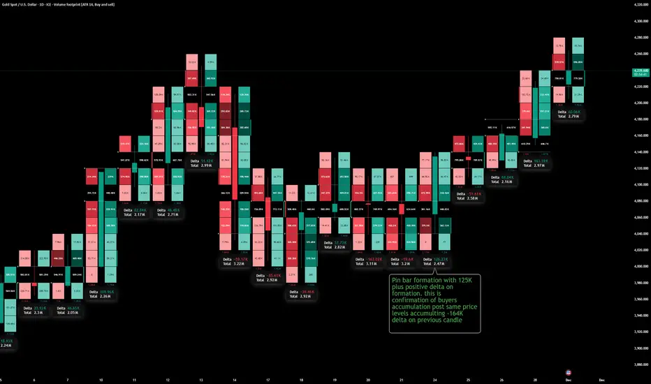 This footprint shows aggressive sellers getting absorbed, then buyers stepping in and reversing the auction, confirmed by a change in delta and a bullish pin bar structure.