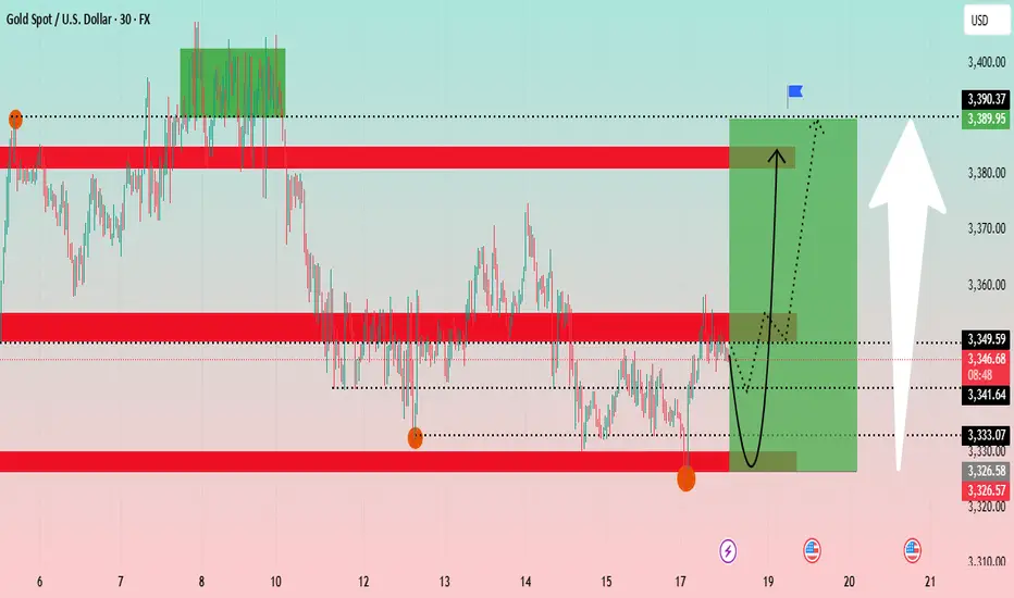 Key Levels: The price is currently at a critical juncture, having tested a support zone around 3,326 - 3,333 USD. This zone has proven to be a strong base. Above it, a significant resistance zone is identified between 3,349 - 3,353 USD. Further up, another major resistance is at approximately 3,389 USD.