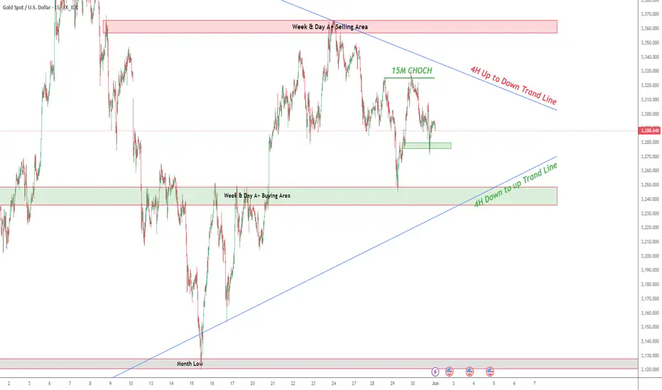 If price retests the Week & Day A+ Buying Area (3,240–3,260) and forms bullish confirmation (like a bullish engulfing candle or 15M CHoCH shift), a long trade could be initiated.