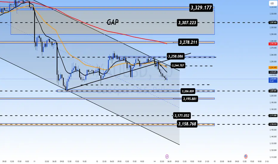 Gold is currently experiencing a strong drop and has closed below the resistance levels outlined in today’s plan at 3296 - 3294. As I mentioned earlier, if there’s a strong breakdown like this, the price could move further down towards the 315x zone, possibly around 3158 - 3156. With the steep decline in the current downward channel, it's not ideal to jump into a BUY signal just yet. The focus should remain on selling, but it’s challenging to find a good entry for SELL right now as the price is under strong selling pressure and there hasn’t been a significant pullback for SELL entries. So, it's best to stay on the sidelines and wait for further developments.For now, you might want to monitor the nearby resistance levels on the M5 or M1 chart for a potential early SELL entry. Key levels to watch are: