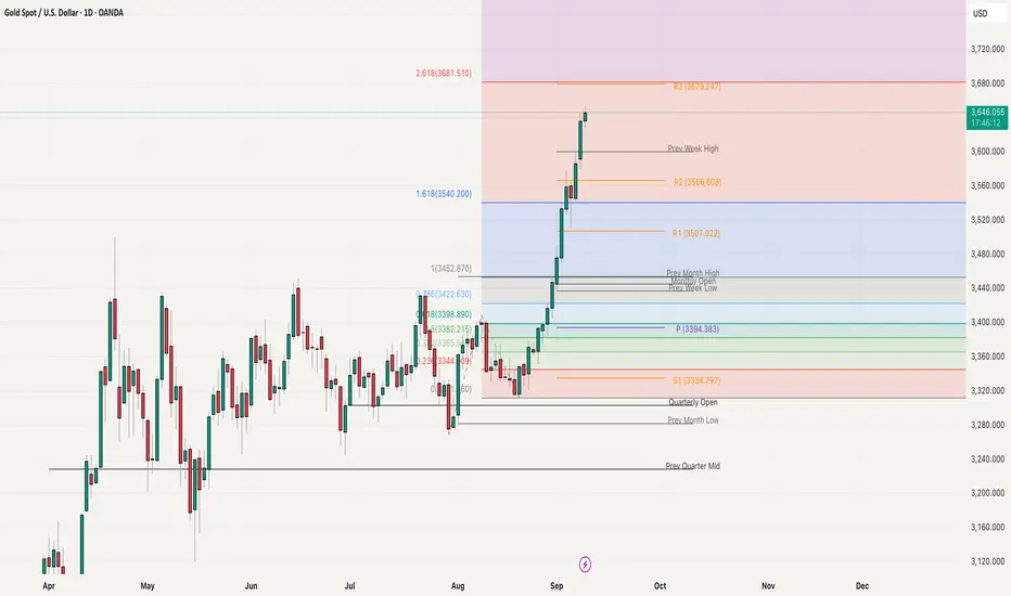 Gold is moving aggressively and relentlessly, day by day, with no signs of exhaustion. The price has once again printed a fresh all-time high and is now trading around 3650, pushing higher without any meaningful rejection on the daily, weekly, or monthly charts. Momentum remains strong, but the rally is clearly stretched, and chasing buys at these levels looks more like FOMO than a high-probability setup. On the Fibonacci extension, the next major resistance is seen at 3681, which also aligns with the monthly R3 level, making it a critical zone to watch. Buying directly into this resistance is risky, and the better approach is to wait for a healthy pullback before looking for new longs. On the downside, 3600 now acts as immediate support, followed by 3550 as the secondary support level. As long as these supports hold, the broader structure remains bullish, but patience will be key for catching the next move.